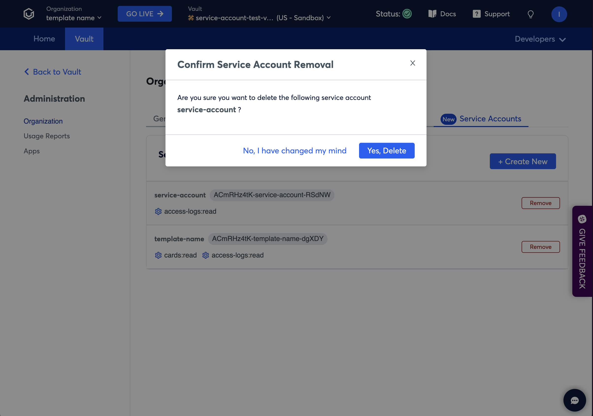 > Currently, there is a limit of having a maximum of 50 service account clients per organization. If you need more, please contact <support@verygoodsecurity.com>